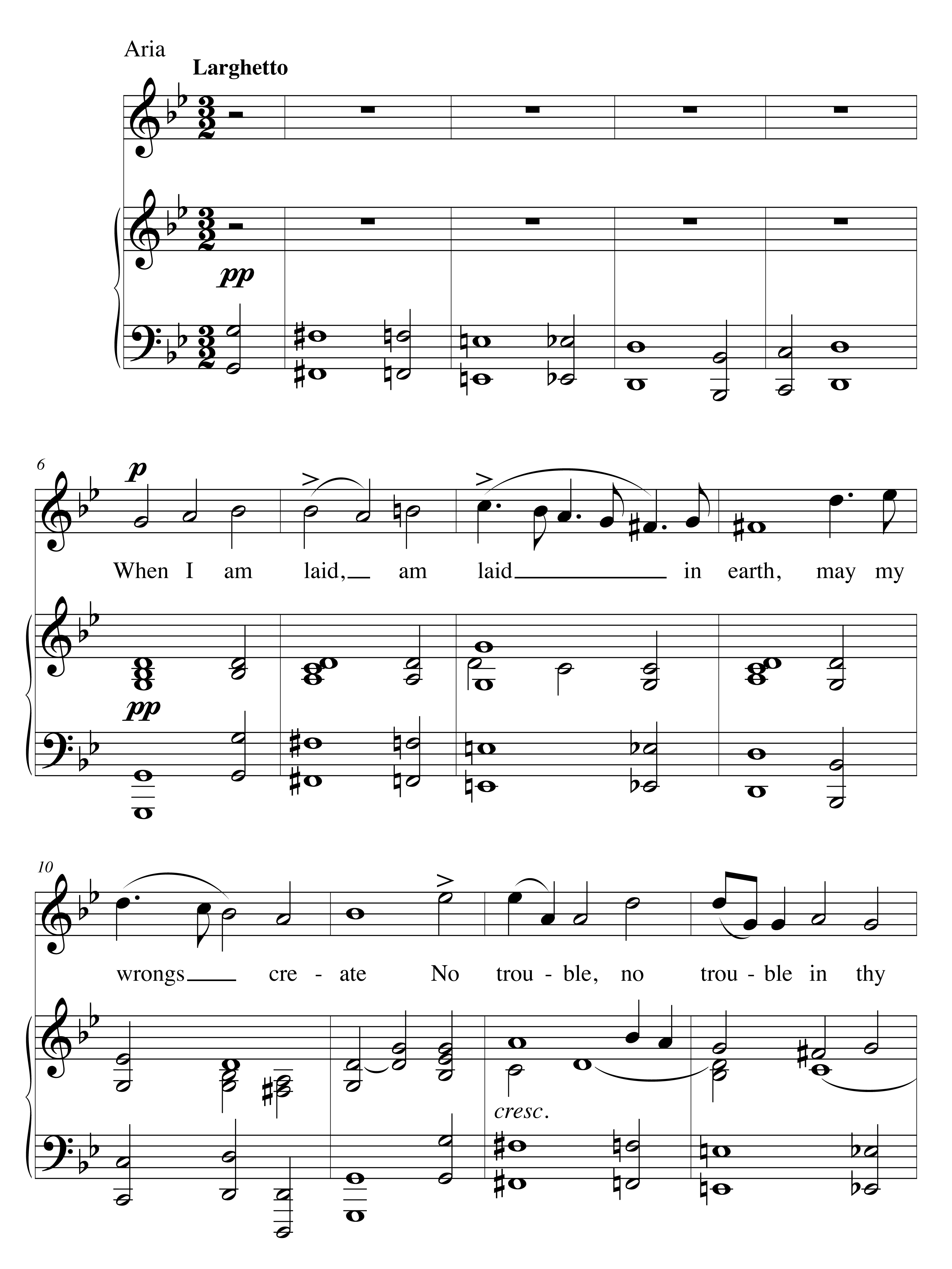 Le célèbre air de Didon ''When I am laid in earth'' s'ouvre sur une légendaire et lugubre ligne de basse chromatique descendante. Celle-ci souligne la lamentation de Didon dans la tradition italienne de l'opéra baroque, la plongeant ainsi inexorablement vers sa fin. L'air est précédé du poignant recitativo secco ''Thy hand, Belinda'' qui dramatise et annonce la mort lente de la reine de Carthage. Influencé par le style français et italien, il est sans doute l'un des plus beaux airs jamais écrits. C'est également avec son chef-d'oeuvre ''Didon et Énée'' que Purcell révélera le seul et véritable opéra baroque anglais, aujourd'hui encore resté unique en son genre. L'opéra en trois actes aurait été écrit au printemps 1689 sur un livret de Nahum Tate et destiné à une petite formation orchestrale. La première représentation connue eut lieu la même année à Chelsea au collège de jeunes filles de Josias Priest et fut interprétée par les pensionnaires elles-mêmes. La présente édition séparée réduite pour voix et piano a été réalisée à partir de l'édition Novello, 1889.