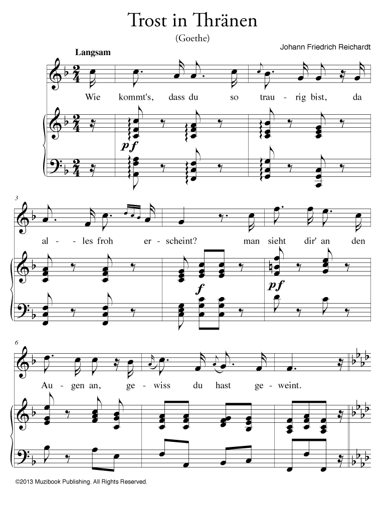 Ces trois poèmes furent à l'origine publiés dans le Taschenbuch auf das Jahr 1804 au sein d’une collection de 22 poèmes intitulée ‘‘Der Geselligkeit gewidmete Lieder’’ (Chansons dédiées à la convivialité). La collection contient initialement quatre poèmes écrits par Goethe (‘‘Schäfers Klagelied’’, ‘‘Trost in Thränen,’’ ‘‘Sehnsucht’’ et ‘‘Nachtgesang’’), et ceux-ci seront toujours publiés ensemble dans les publications ultérieures organisées par le poète. Toutefois - dans un objectif purement musical et pour une comparaison stylistique de l’arrangement de chaque compositeur - nous avons ici choisi d’en retenir trois; ceux-là même qui retiendront l’attention de Schubert durant la journée du 30 novembre 1814. Reichardt et Zelter étaient tous deux les conseillers musical de Goethe et avaient mis en musique la plupart de ses poèmes avant même que Schubert ne vienne au monde. Bien que Schubert se soit distingué par la grandeur de sa musique, leur influence n’a cessée d’inspirer le jeune compositeur dans l’écriture de ses lieder. Les trois poèmes ici présentés illustrent parfaitement cette influence, cela tout en révélant le style proche à chacun de ces compositeurs et les nouvelles perspectives musicales apportées par Schubert. Le présent ouvrage a été réalisé à partir des sources manuscrites et éditions originales lorsque celles-ci étaient disponibles.