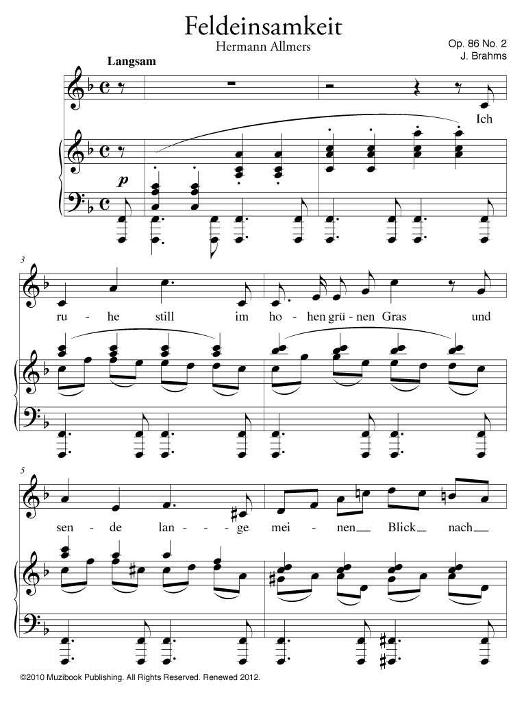 Feldeinsamkeit op. 96 n° 2 par Johannes Brahms. Piano et Chant. Voix moyenne (original)*. Allemand. Intermédiaire-Avancé. MCL208b