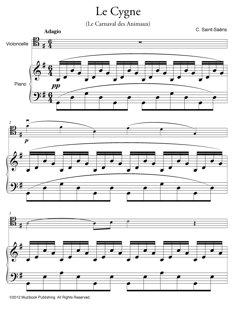 Le Cygne. Extrait du Carnaval des Animaux par Camille Saint-Saëns. Violoncelle et piano avec partie séparée. Intermédiaire. MCL102