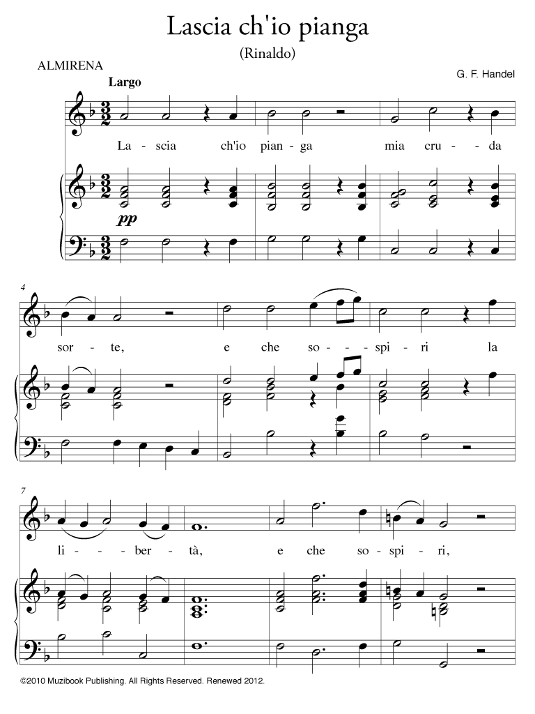 Lascia ch'io pianga. Air extrait de l'opéra Rinaldo par Georg Friedrich Händel. Piano et Chant. Voix haute (Original)*. Italien. Intermédiaire. MCL63a
