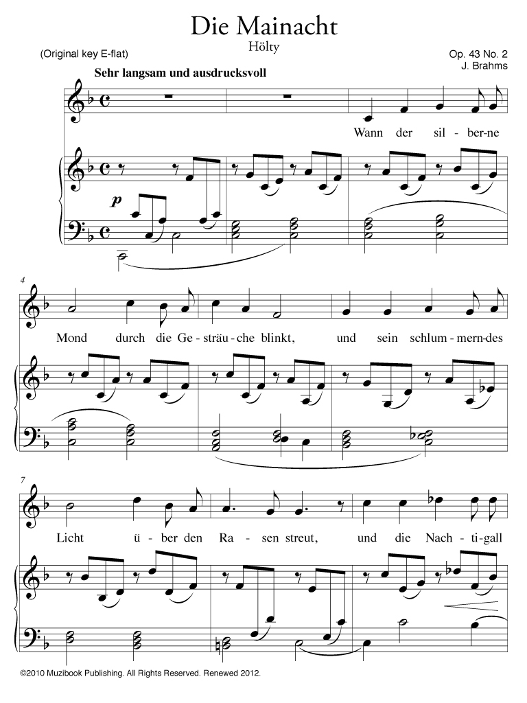 Die Mainacht op. 43 n° 2 par Johannes Brahms. Piano et Chant. Voix haute*. Allemand. Intermédiaire-Avancé. MCL157a