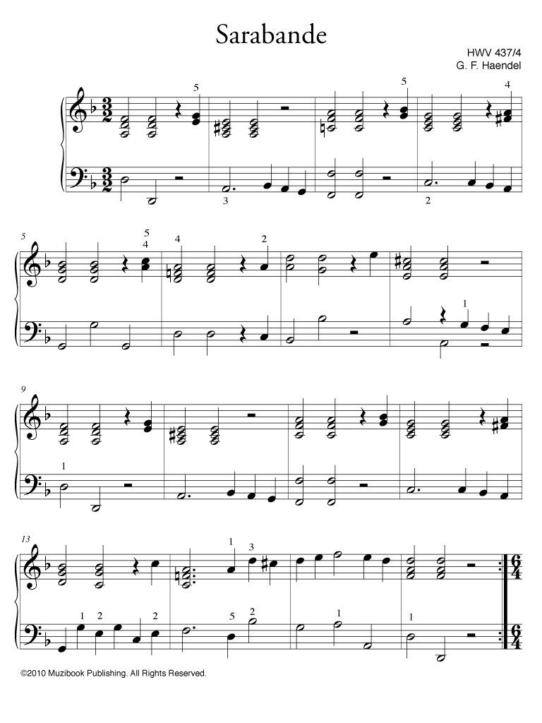 Sarabande extraite de la Suite en ré mineur n° 4 HWV 437 par Georg Friedrich Haendel. Piano. Doigtés. Intermédiaire. MCL91