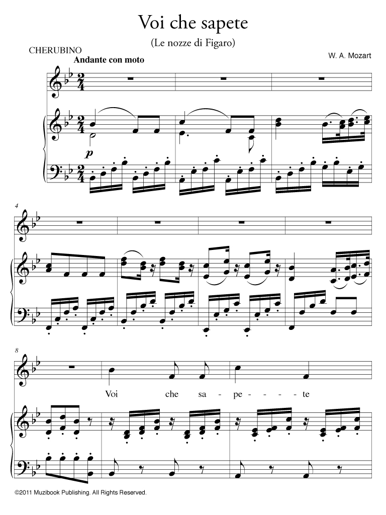 Air extrait de l'opéra ''Le nozze di Figaro'' (Les Noces de Figaro) par Wolfgang Amadeus Mozart. Piano et Chant. Mezzo-soprano (ou soprano). Italien. Intermédiaire. MCL593