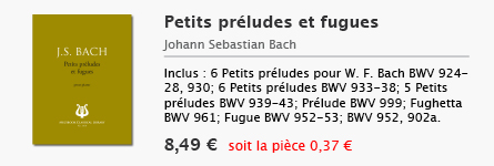 En 1717, Bach fut appelé à remplacer le compositeur Johann David Heinichen comme maître de chapelle à Köthen où il enseigna la musique jusqu'en 1723. C'est au début de l'année 1720 qu'il commença à rassembler les pièces pour clavier qui constitueront plus tard le «Klavierbüchlein für Wilhelm Friedemann Bach». Cet ouvrage lui servira pour l'éducation musicale de son fils aîné alors agé de dix ans. La collection comprendra notamment les six petits préludes ici sélectionnés pour l'élaboration de la présente édition, onze préludes tirés du «Clavier bien tempéré» (premier livre, 1722), les inventions à deux et trois voix, et quelques suites et mouvements divers publiés séparément dans notre catalogue. Les «Six petits préludes pour les commençants» BWV 933-938 furent également récoltés durant la même période et seront quant à eux destinés à l'usage des élèves du compositeur. Outre ces collections de petits morceaux, figurent à notre ouvrage les cinq petits préludes BWV 939-943, le prélude en do mineur pour luth BWV 999, les préludes et fuguettes BWV 899 et 902a, ainsi que trois petites fugues traditionnellement incluses à cette collection. Cet ouvrage nouvellement édité à partir des sources originales et manuscrites est indispensable à tout pianiste débutant désireux d'acquérir un toucher clair et net de chaque doigt tout en s'initiant à l'art de la musique.