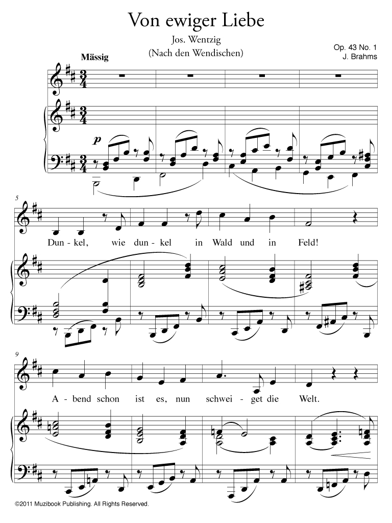 Von ewiger Liebe op. 43 n° 1 par Johannes Brahms. Piano et Chant. Voix moyenne (original)*. Allemand. Avancé. MCL530b