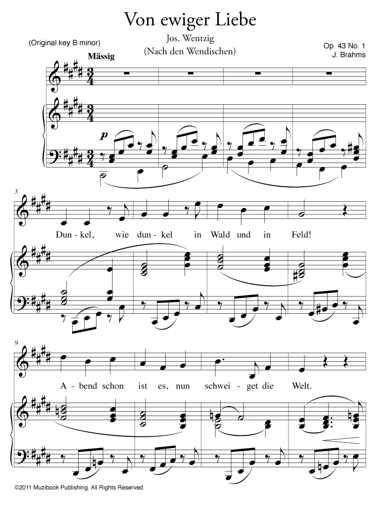 Von ewiger Liebe op. 43 n° 1 par Johannes Brahms. Piano et Chant. Voix haute*. Allemand. Avancé. MCL530a