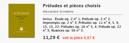 Considérée comme l'une des premières grandes oeuvres de Scriabine, l'étude op. 2 n° 1 qui ouvre ce recueil témoigne de l'impressionnante maturité musicale du jeune compositeur russe, alors âgé de 15 ans. L'opus se complète avec un bref prélude suivi d'un impromptu en forme de mazurka. C'est entre 1895 et 1896 que Scriabine composa la plupart des préludes op. 11 et 16 qui étaient initialement prévus pour être publiés avec d'autres compositions dans un cycle de 48 préludes. Huit de ces préludes remarquables par leur sonorité si caractéristique ont été retenus dans cette édition. Comme le compositeur l'a lui-même souligné dans une lettre adressée à son éditeur datée du 23 mars 1896, chaque prélude est une composition pouvant exister de façon autonome. À la suite de cette première série, l'année 1897 voit naître les quatre préludes op. 22. Dans sa manière atypique d'écrire, Scriabine avait le don de captiver les sens en très peu d'espace, comme le démontre la pièce miniature tardive qui conclut ce recueil. Le présent ouvrage a été réalisé à partir des premières éditions des oeuvres de Scriabine et pourra constituer un excellent départ pour le pianiste désireux de s'ouvrir à l'univers mystique du compositeur.