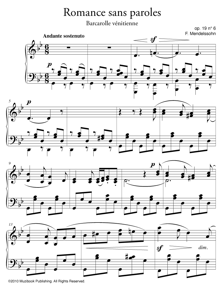 Romance sans paroles op. 19 n° 6 (Barcarolle vénitienne) par Félix Mendelssohn. Piano. Intermédiaire. MCL245
