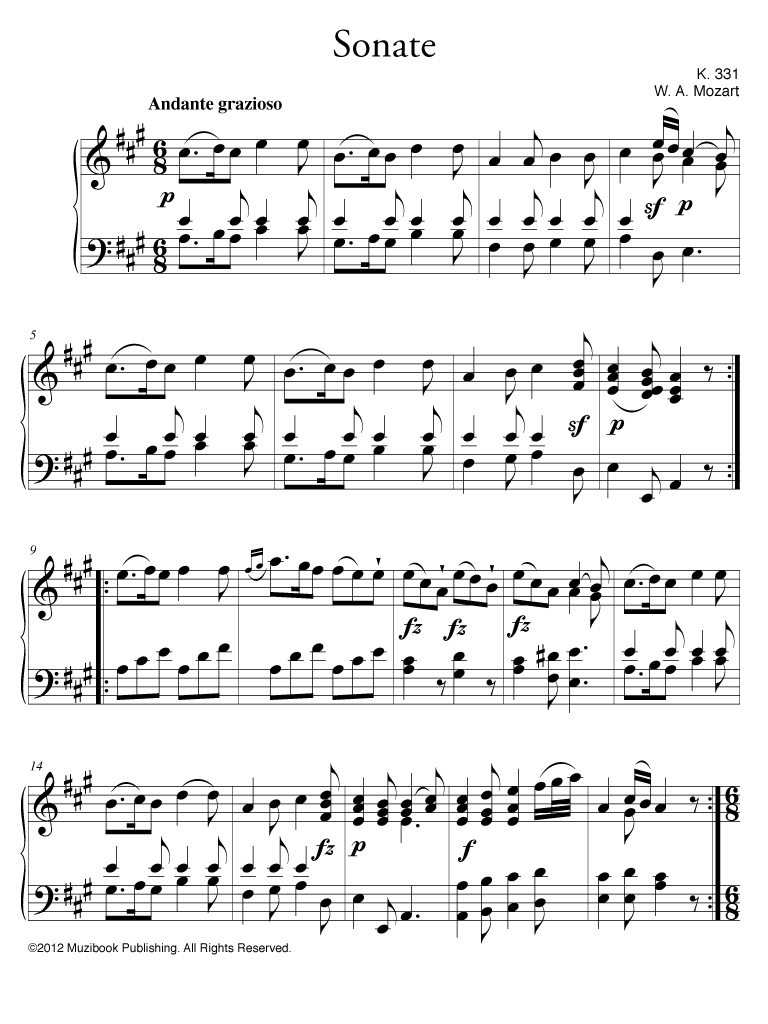 Sonate en la majeur K 331 par Wolfgang Amadeus Mozart. Piano. Intermédiaire-Avancé. MCL857